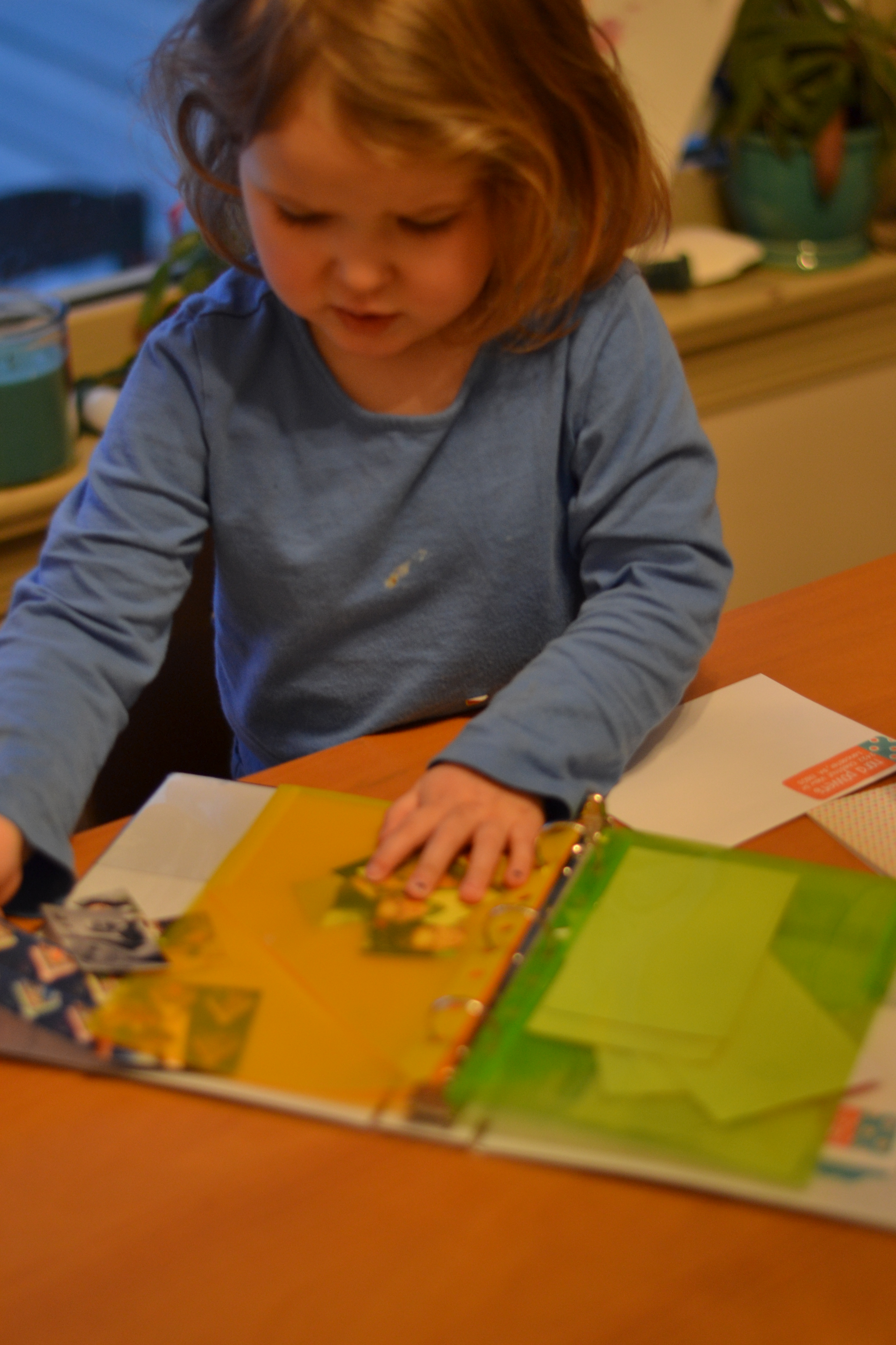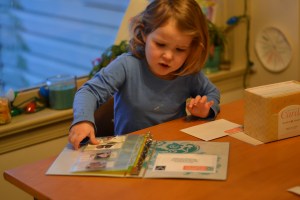 I put a stamp and some address labels on a spare envelope and taped it to the inside cover of the writing binder so Nora could use it as a model for how and where to place her stickers. I bought some pages with pockets in which to hold the address labels. Since she can’t yet read the labels, we taped photos of friends and family on the front of the sleeves so she can identify the labels. We just updated our photos by repurposing this year’s holiday cards. The cut-out faces of our favorite friends now line the pages of our book. She’s able to choose a person by photo, select the appropriate label, affix the stickers on the envelope, and stuff and seal the envelope herself. The only thing she can’t do on her own is write the message.
