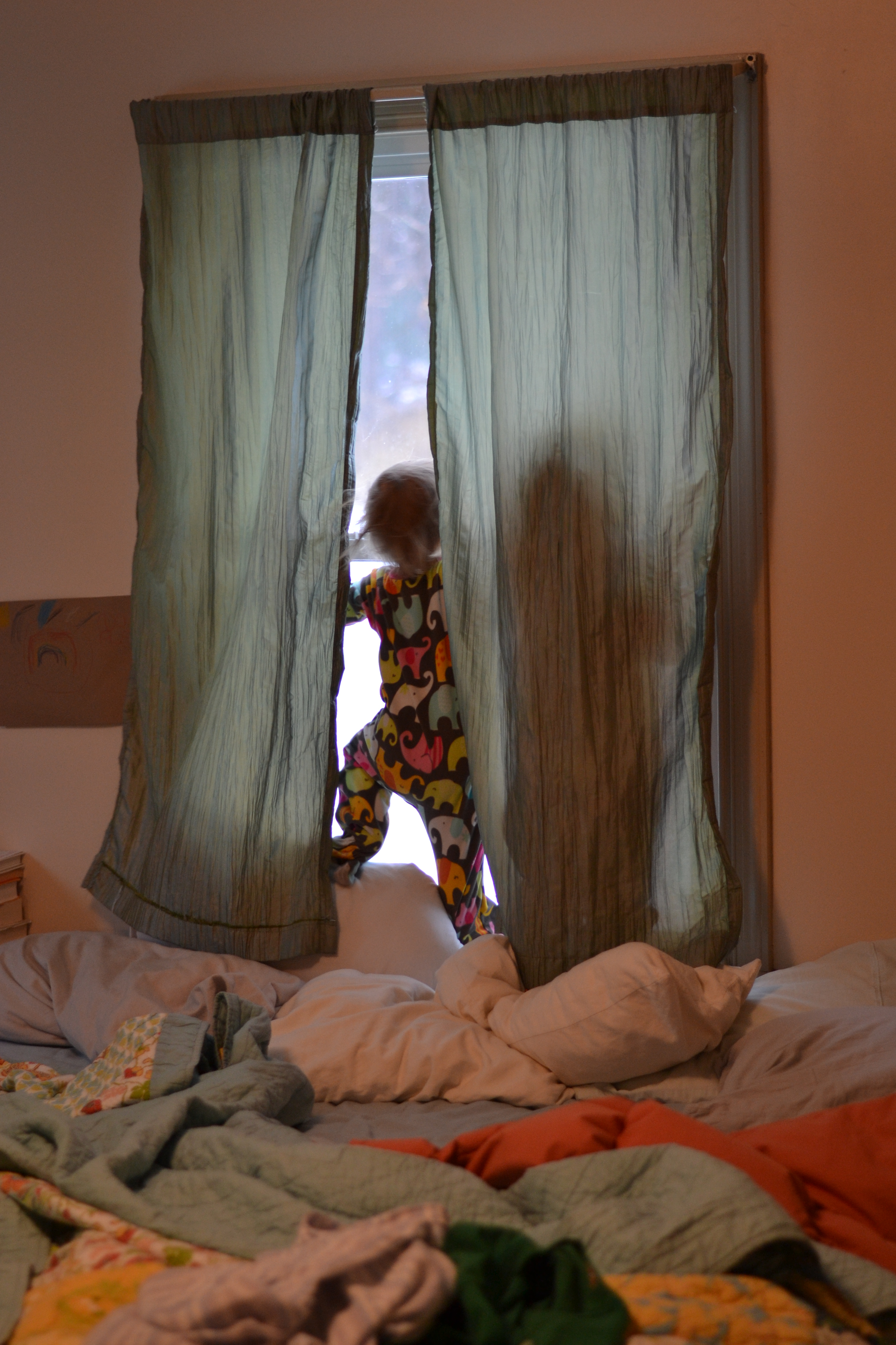 The girls love to climb up on the window sill and hide behind the curtain panels. Then they let go with their hands and fall back, landing on the cushiony bed. It takes a lot of self-control for me to not freak out about this kind of play for fear of injury, especially after Nora just got four stitches on her forehead after running, tripping, and then careening into the dining room table. I let them be, and no one got hurt.