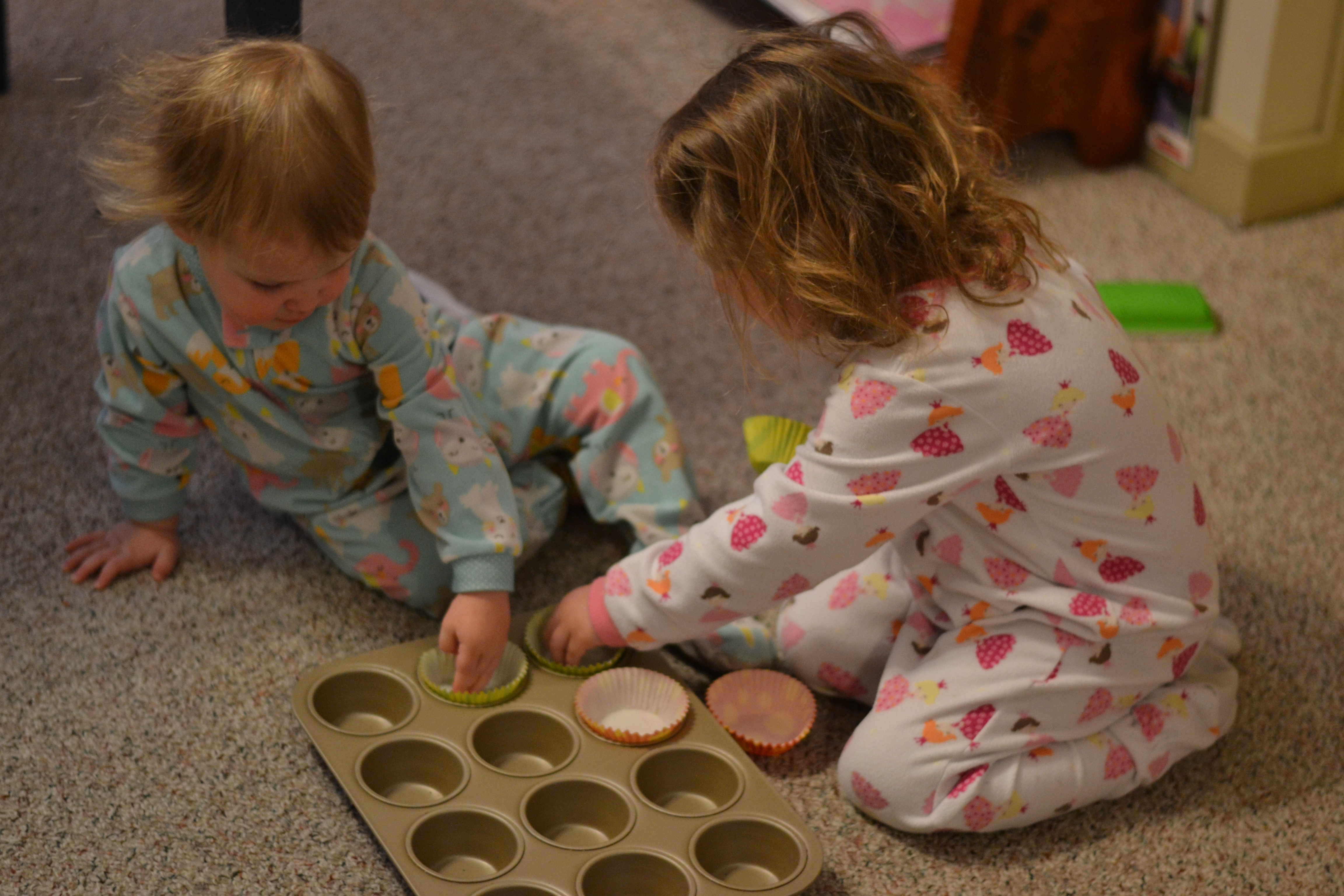 Above: Our oldest’s typical summer-do a couple of years ago. Sweat and sunscreen make for good styling. Below: Making muffins with weekend morning bedheads.