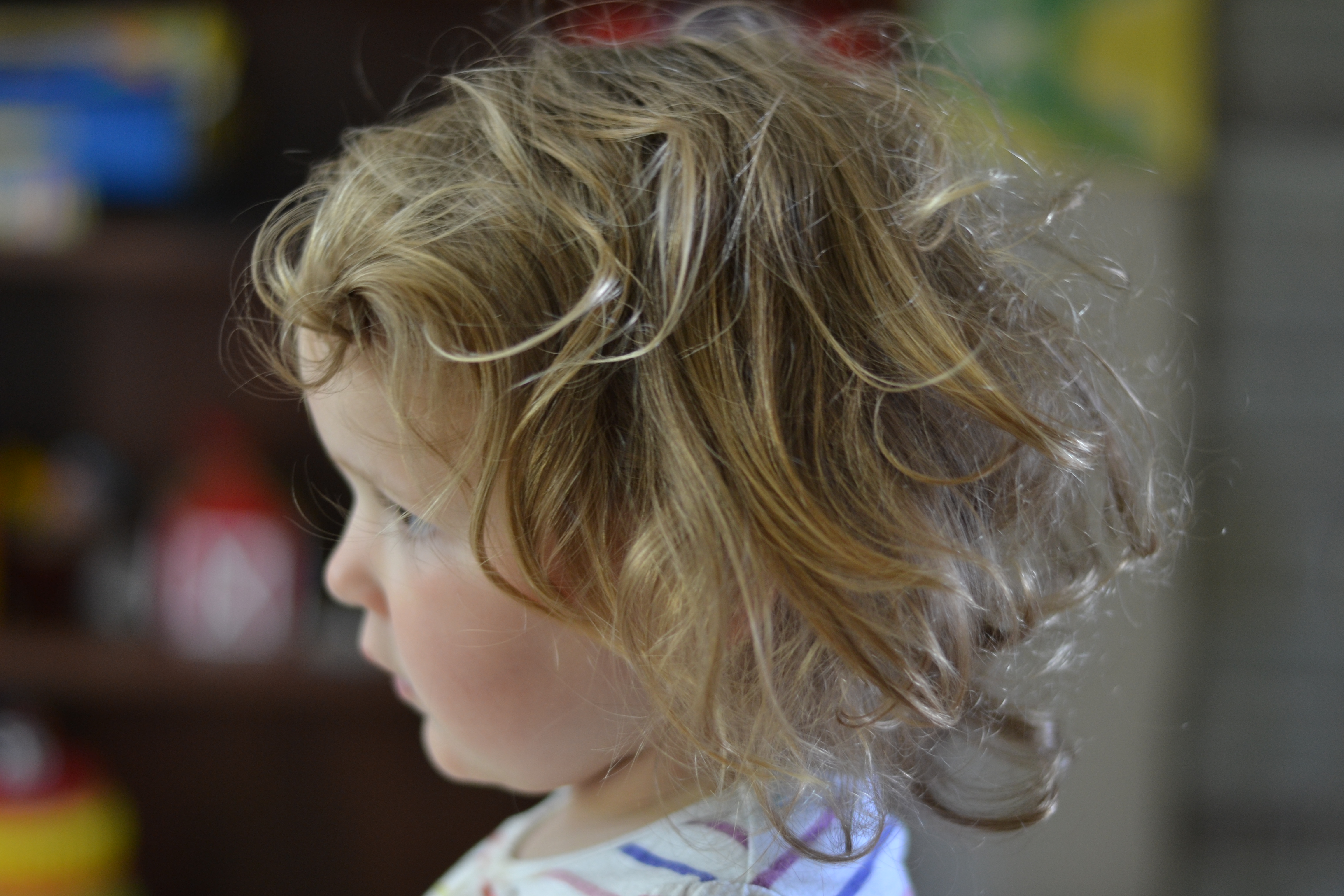 Both my husband and I have thick, textured, wavy hair. It’s one of our best features! Our girls, however, have been blessed—or cursed rather—with thin, brittle, straw like locks. Up until very recently, neither girl has preferred to have her hair done up in barrettes or ponytails, which makes matters worse, since the wayward strands cannot be contained. Basically, the girls’ hair is in a state of ratty bed head throughout the day, despite several attempts to brush, comb and detangle it. It’s also a sad fact that our littlest has less hair than most six-month-olds; she will be two in just over a month.