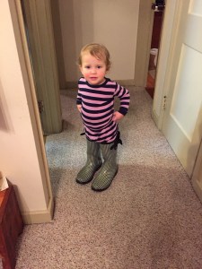 Trying on her mother’s boots. The poor thing couldn’t take a step!